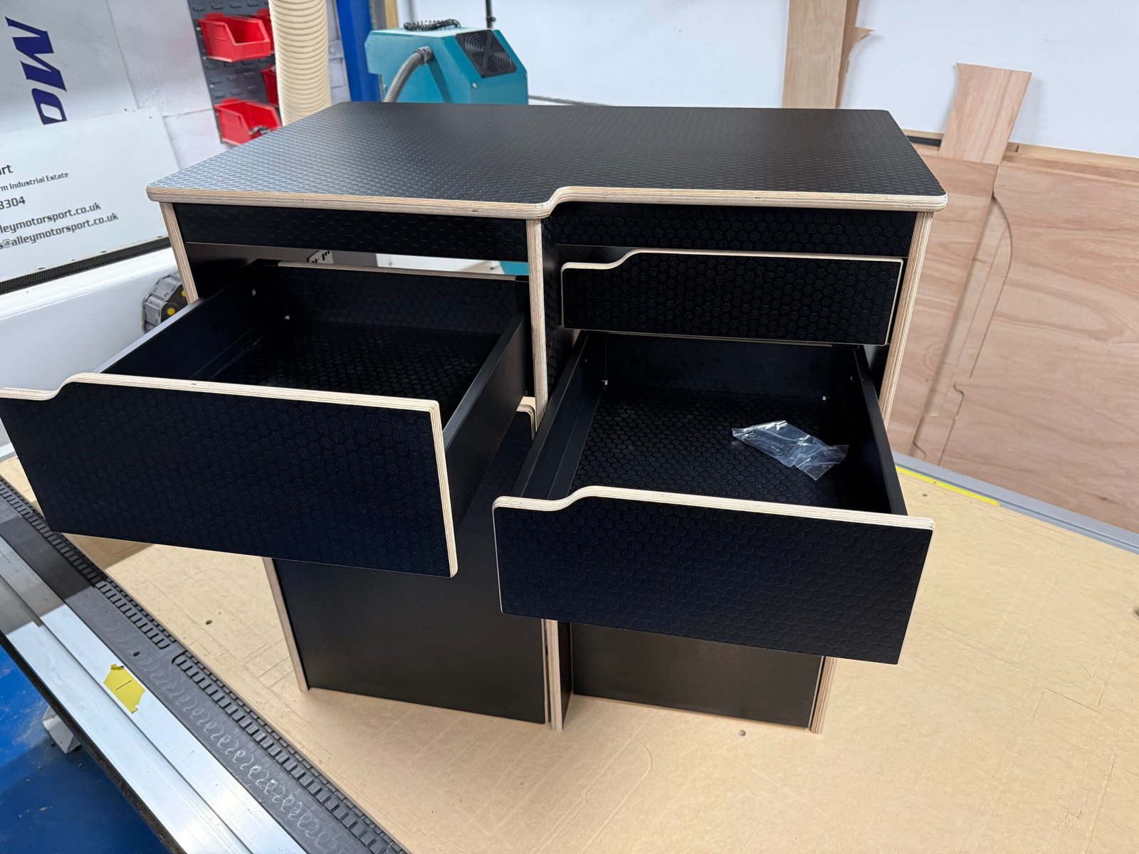 Also included on the right is a top cupboard space, drawer and larger lower cupboard. All drawer runners are the latest “Hafele Modern Drawer” design as used in our camper builds. These have smooth operation and closing without any slamming or rattling of other drawer systems on the market. Each drawer has a load capacity of up to 40kg!